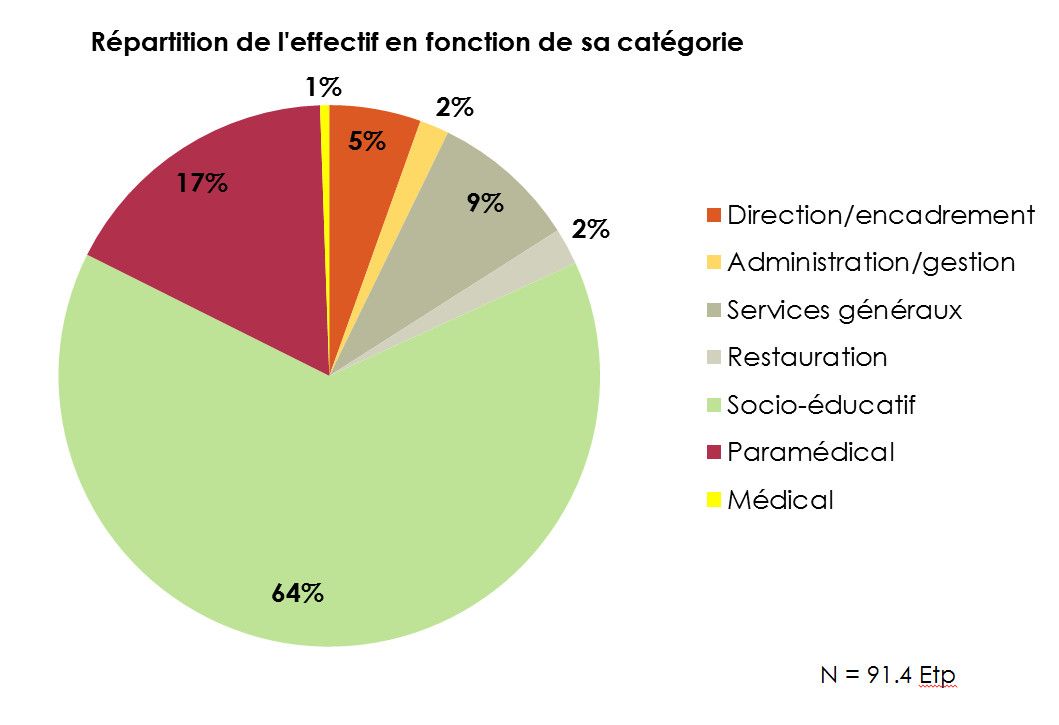 Durant les 5 ans à venir, il n’est pas prévu de modification de l’effectif. 84% de l’effectif est dédié aux prestations directes. Les 16% restant assurent les fonctions dites de support. La catégorie « socio-éducatif » définie par l’ANAP regroupe l’équipe d’accompagnement au quotidien ainsi que la coordinatrice du pôle hébergement et l’assistante sociale.