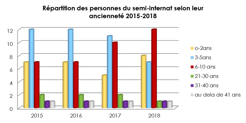 La durée moyenne des séjours des personnes de 2015 à 2018 qui quittent l’accueil de jour pour rejoindre le pôle hébergement ou un autre établissement est de 13 ans et 3 mois. Sur cette période, plus de 50% de l’effectif a moins de 5 ans d’ancienneté. La moyenne d’ancienneté est stable, elle reste entre 8 et 9 ans. Les personnes accueillies présentent plus de troubles cognitifs. Ceci s’explique du fait de l’évolution législative qui facilite l’inclusion des personnes avec handicap moteur sans trouble cognitif associé.