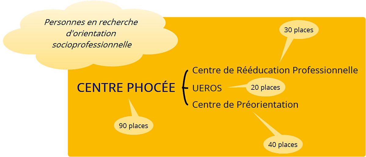 Le Centre Phocée est situé dans une ancienne école communale au cœur du 14e arrondissement de Marseille. Il est composé de 3 établissements, qui constituent ses 3 Unités principales : l’Unité de Préorientation, l’Unité de Réentraînement au Travail, et l’UEROS. Il accueille environ 300 usagers sur une année, à raison de 90 personnes simultanément en stage, reconnues travailleurs handicapés et orientées par la CDAPH des MDPH. Le public reçu a alors le statut de stagiaire de la formation professionnelle et à ce titre peut percevoir une rémunération versée par la région.
