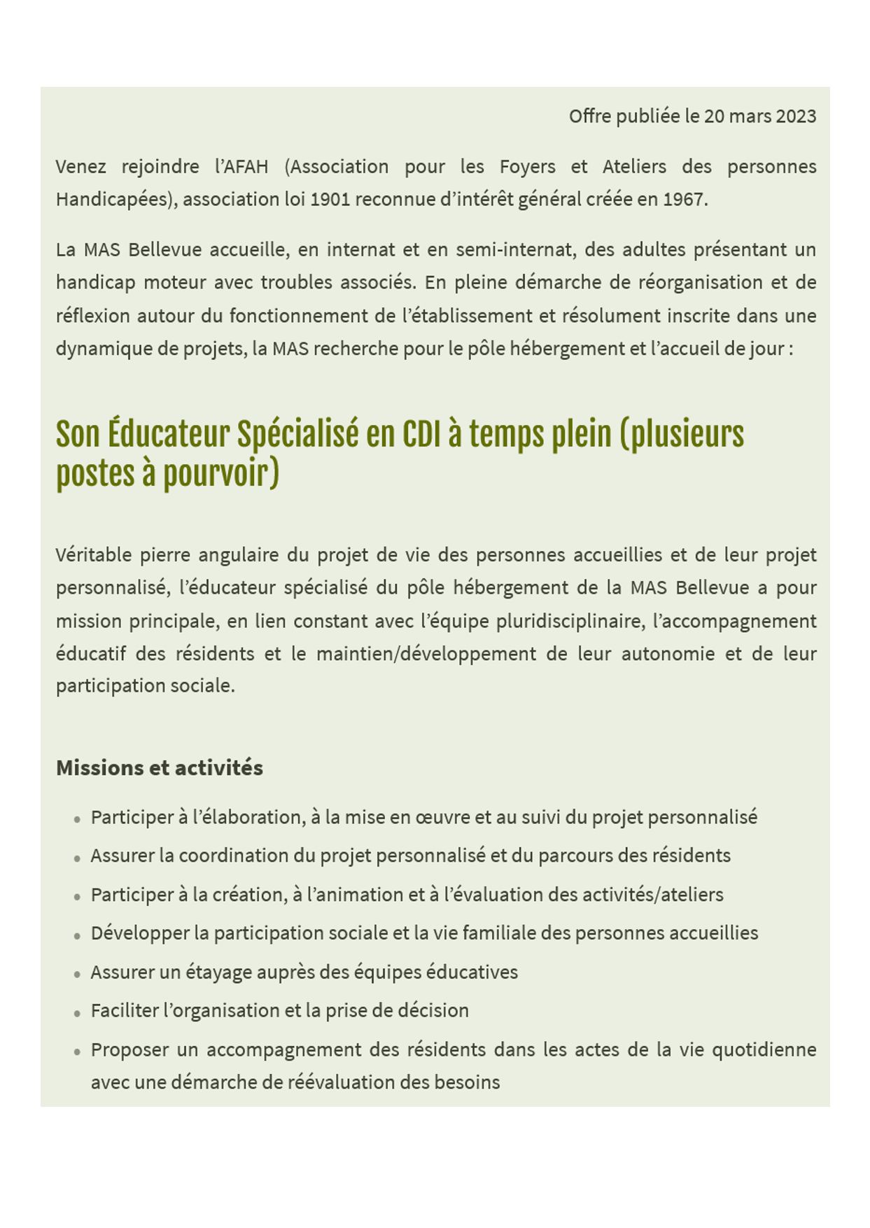Venez rejoindre l’AFAH (Association pour les Foyers et Ateliers des personnes Handicapées), association loi 1901 reconnue d’intérêt général créée en 1967.
